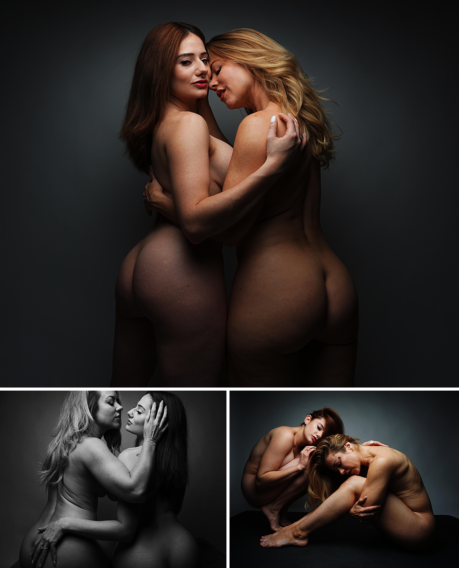 The compositions are tight, deliberate. Skin presses into skin. Hands guide, pull, rest — never passive, always intentional. The lighting isolates the figures against darkness, forcing the viewer to confront the connection rather than escape into environment.